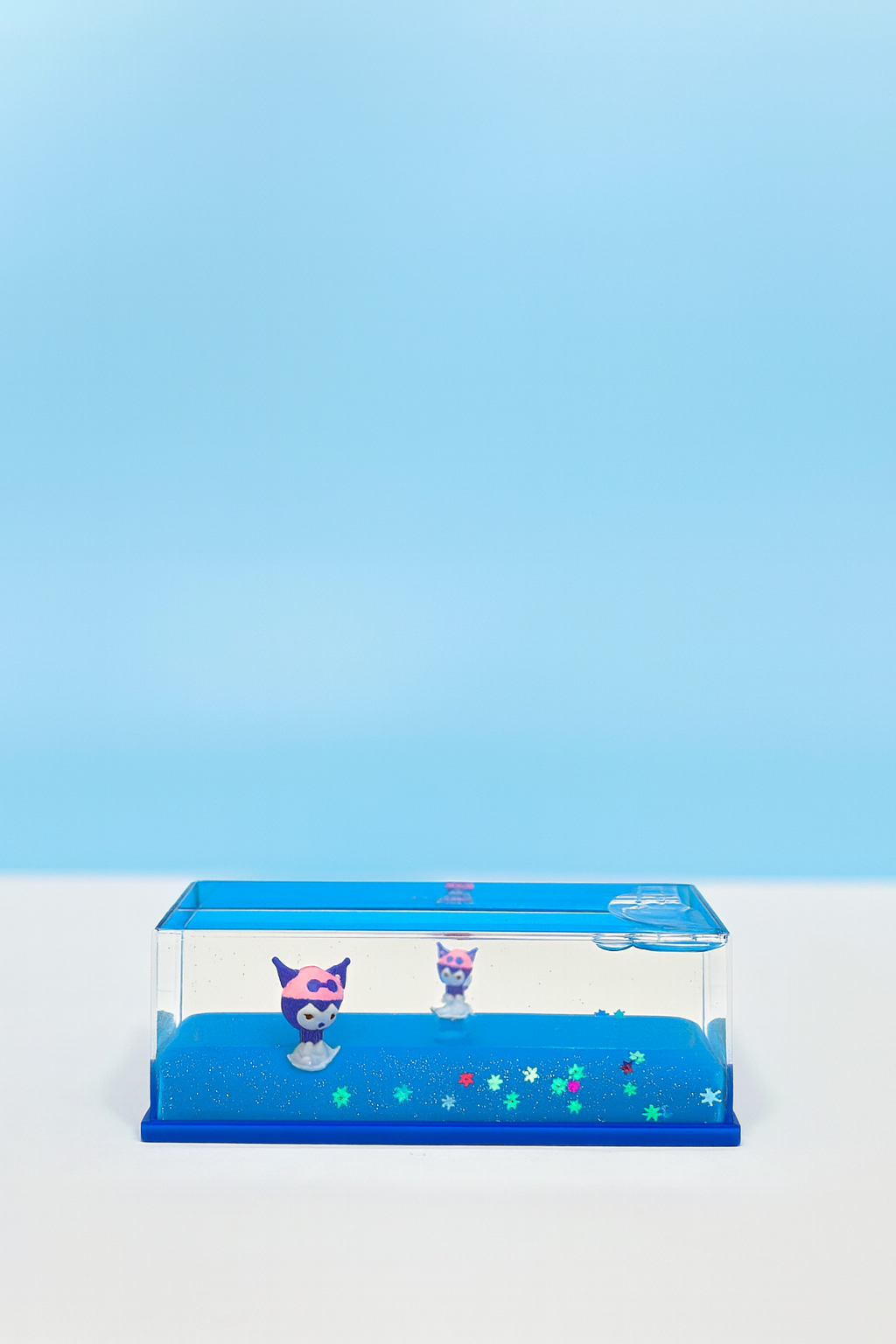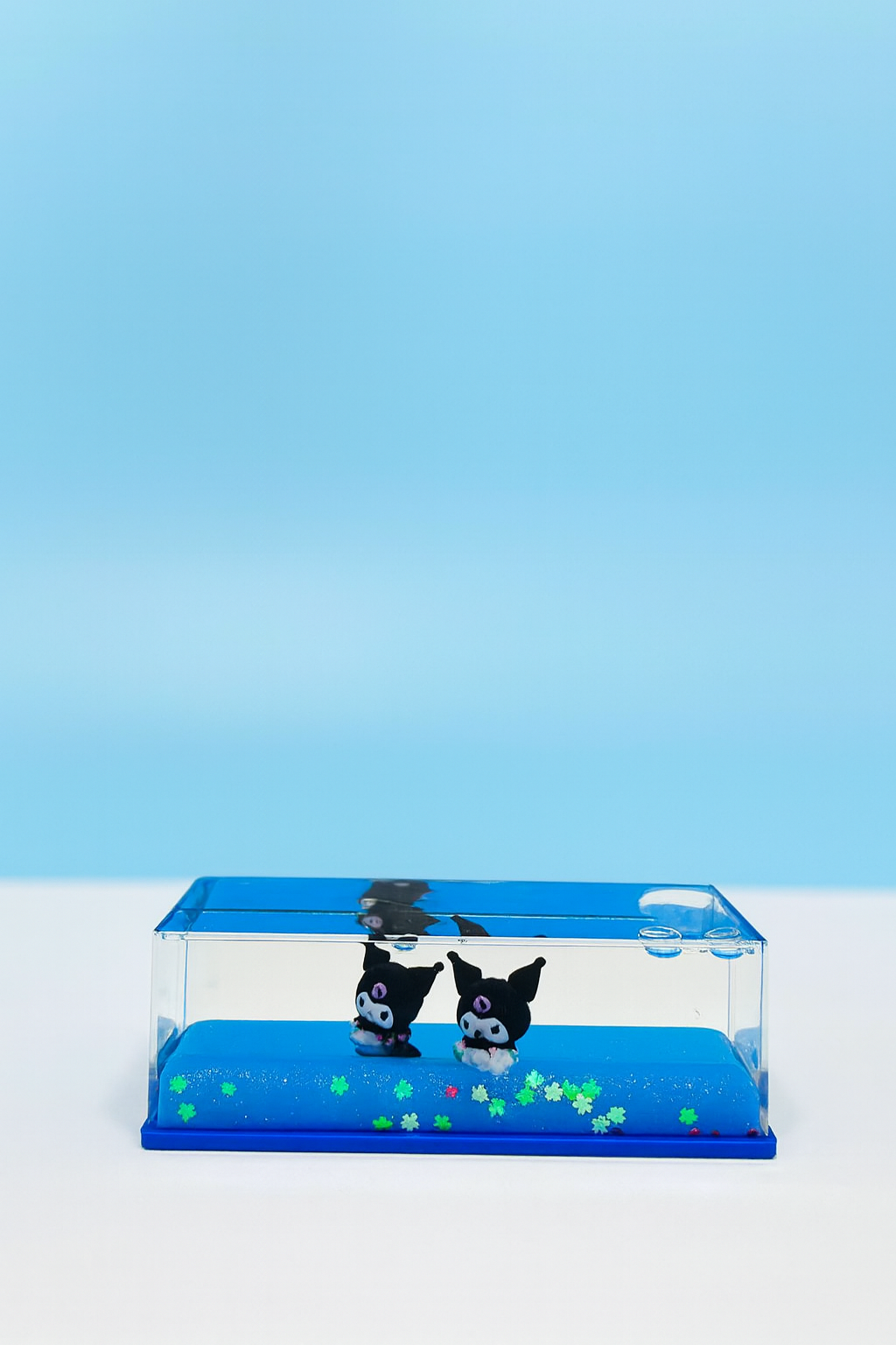 دکوری مایع طرح کاراکتری کورومی با رنگ آبی شفاف و عروسکهای بامزه داخل مایع، جلوهای خاص و آرامشبخش دارد.