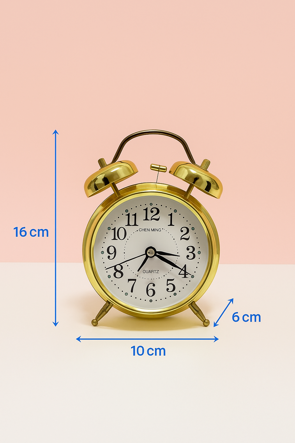 ساعت رومیزی فلزی طلایی ، با طراحی کلاسیک و صدای زنگ نوستالژیک، انتخابی ایده‌آل برای دکور شیک منزل یا محل کار شماست.