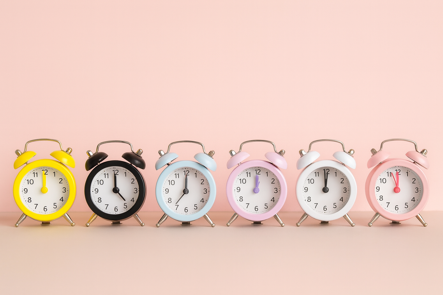 مجموعه ساعت زنگدار فانتزی در شش رنگ مختلف با طراحی کلاسیک و مکانیزم دقیق کوارتز، مناسب برای دکور، میز کار و هدیهای خاص از پخش معلم.