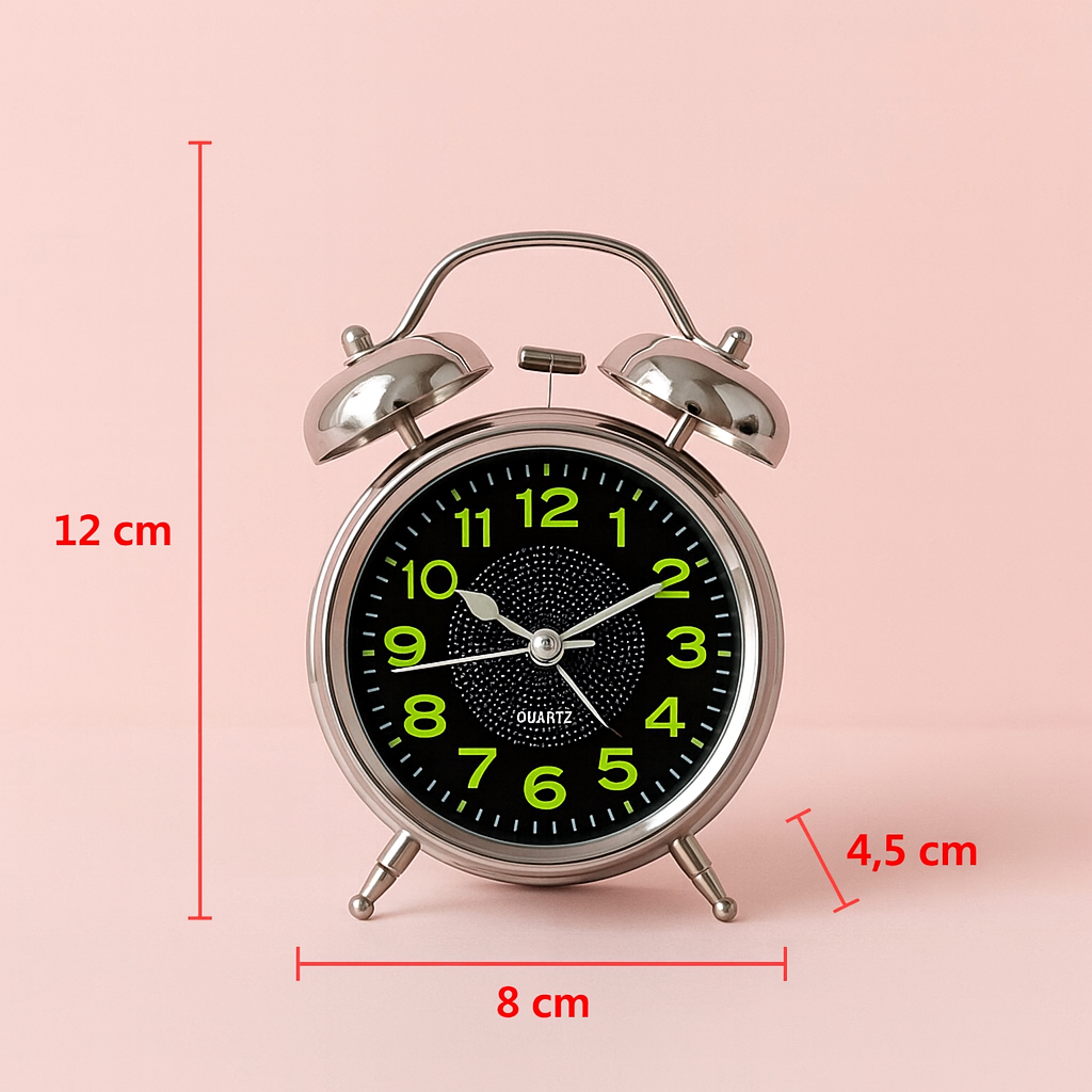 ساعت رومیزی فلزی مدل کلاسیک با صفحه مشکی و اعداد سبز نئون، طراحی خاص با موتور بی‌صدا، بدنه نقره‌ای و پایه‌های فلزی براق. مناسب برای دکوراسیون منزل و محیط کار.