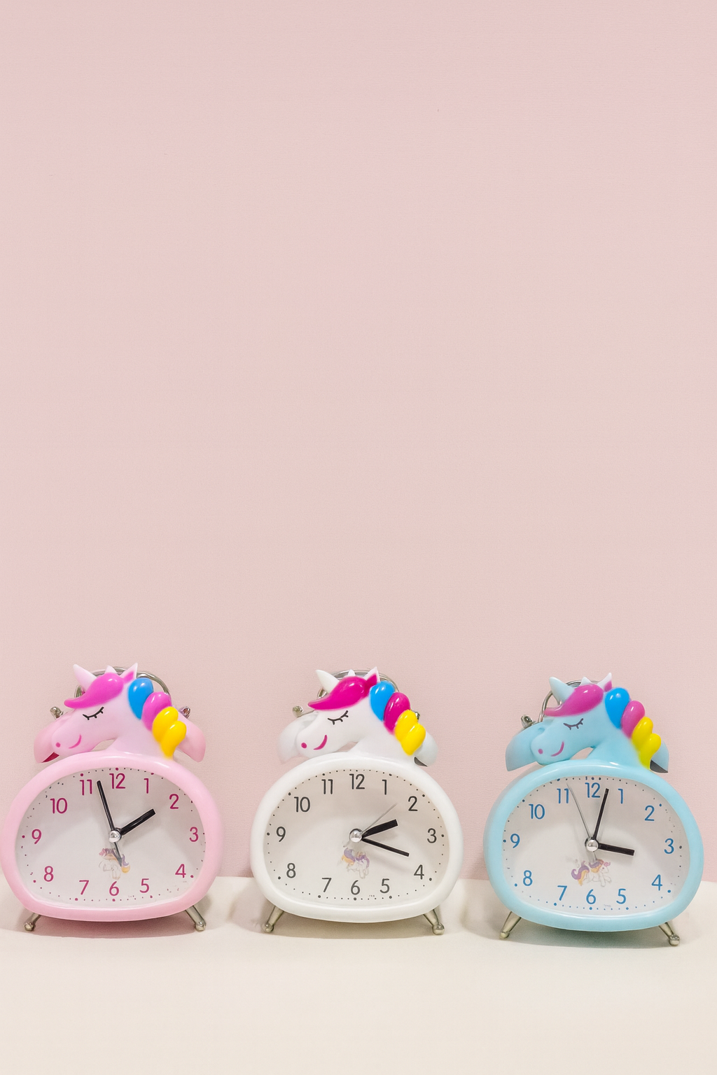 ساعت رومیزی طرح یونیکورن در سه رنگ زیبا (صورتی، سفید، آبی) با طراحی فانتزی و پایه‌های فلزی، مناسب برای اتاق کودک و هدیه‌های خاص.