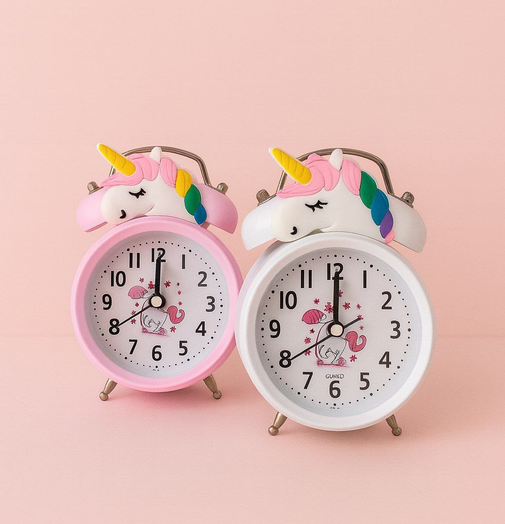 ساعت رومیزی فانتزی طرح یونیکورن، در دو رنگ سفید و صورتی با طراحی سهبعدی و رنگینکمانی. ارتفاع ۱۴ سانتیمتر، عرض ۹ سانتیمتر، قطر ۵ سانتیمتر. موتور بیصدا، پایه فلزی محکم و مناسب برای دکور اتاق کودک.