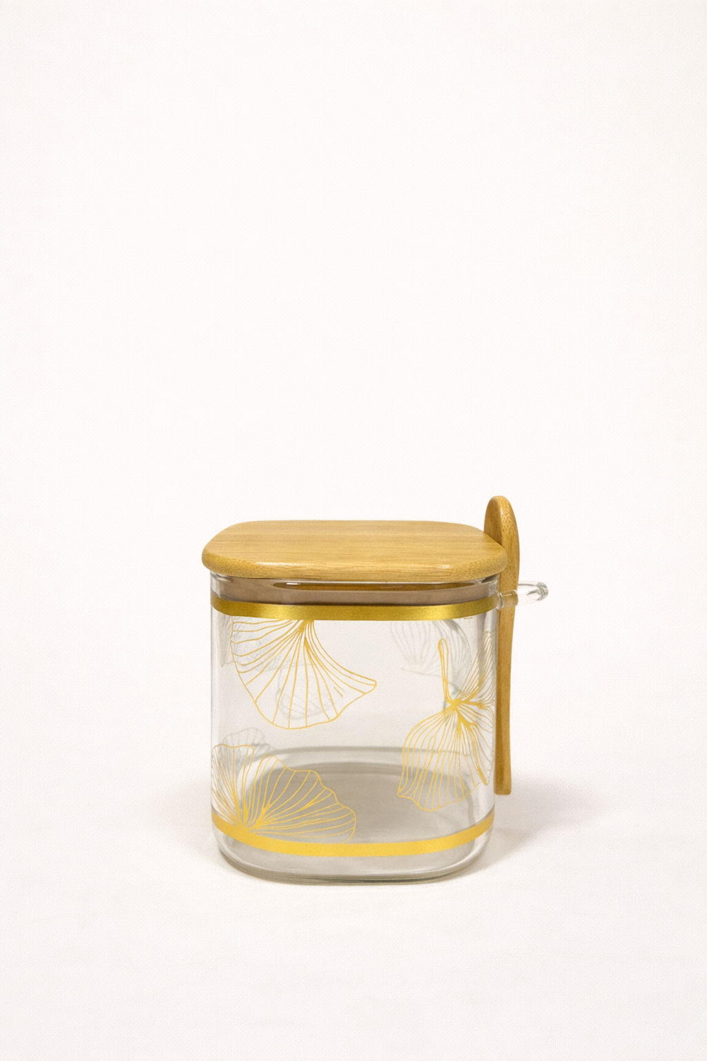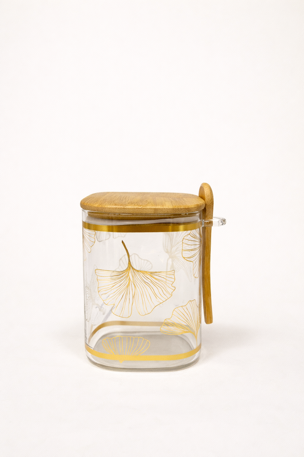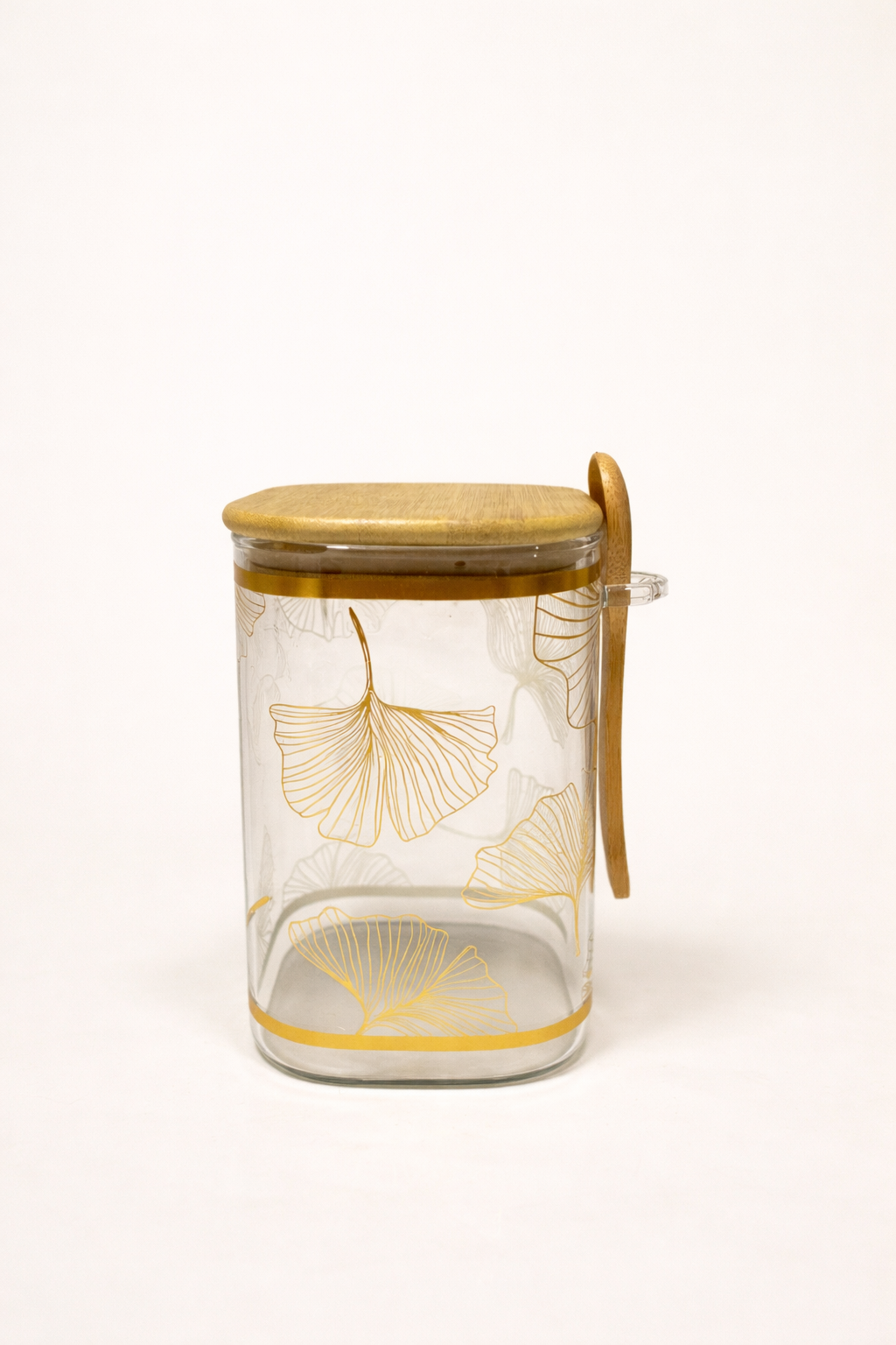 بانکه شیشهای ۳ سایز با درب و قاشق چوبی، طرح برگ طلایی، مناسب نگهداری حبوبات، چای و ادویه با طراحی شیک و دکوری.