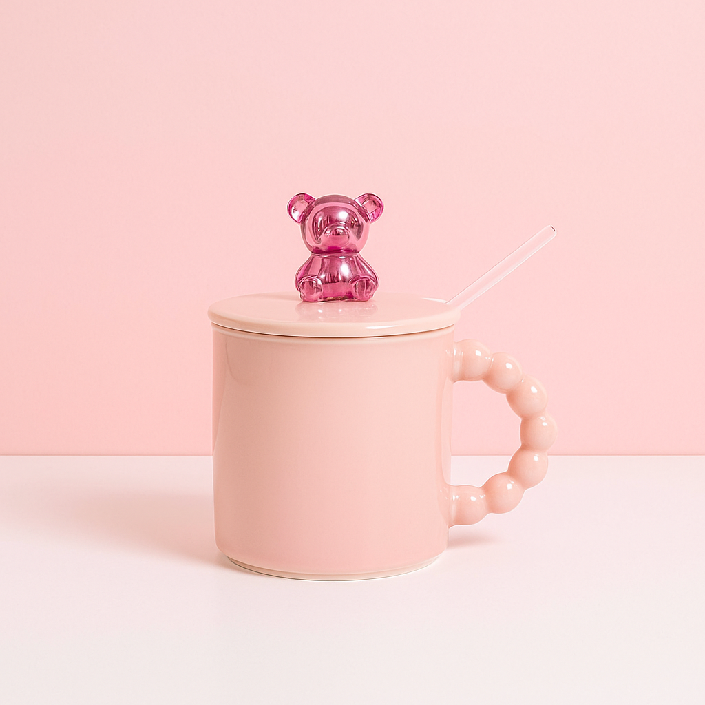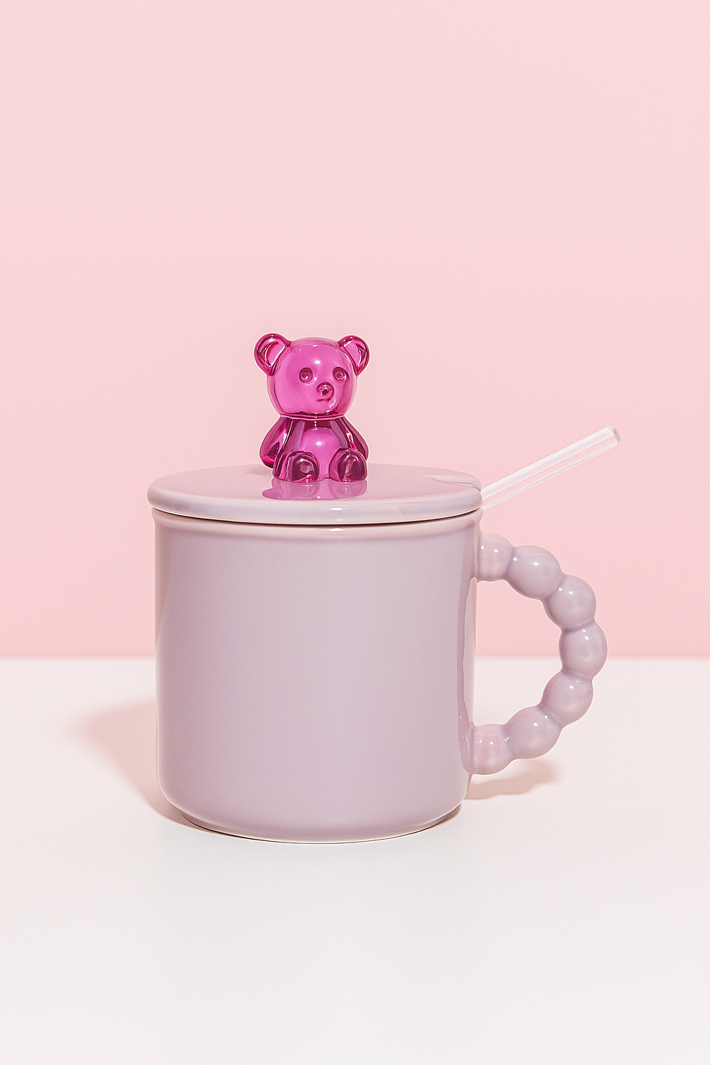 ماگ فانتزی خرسی دربدار سرامیکی در رنگهای صورتی و یاسی با عروسک خرس ژلهای صورتی روی درب و قاشق شفاف. مناسب هدیه، تزئین و استفاده روزمره همراه نی