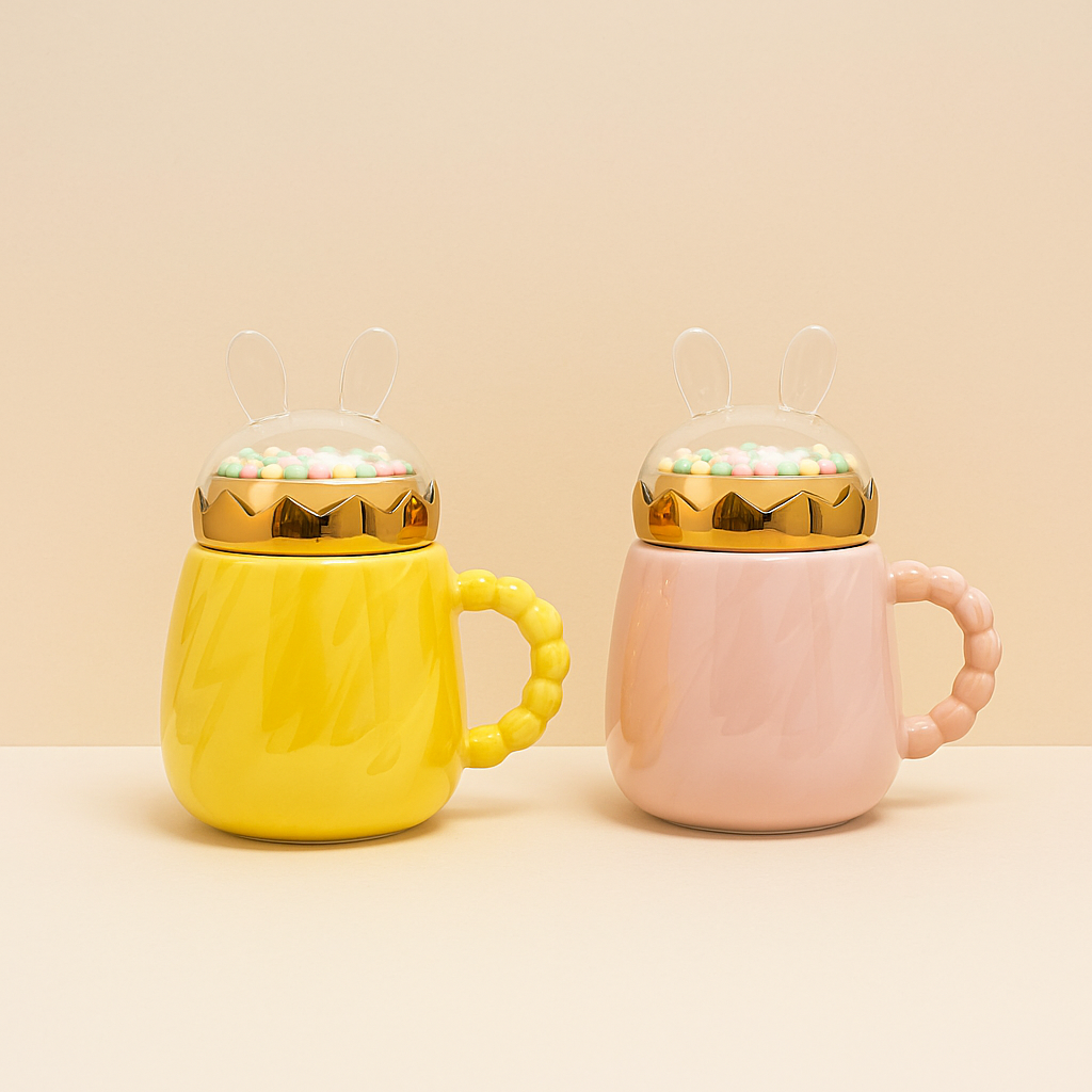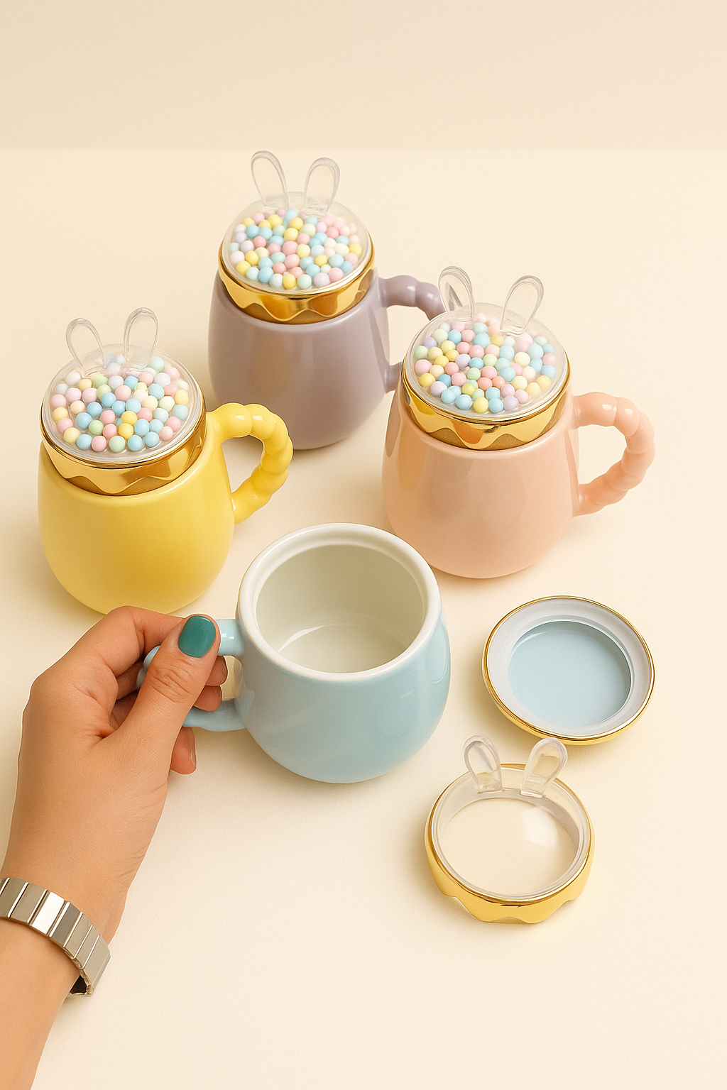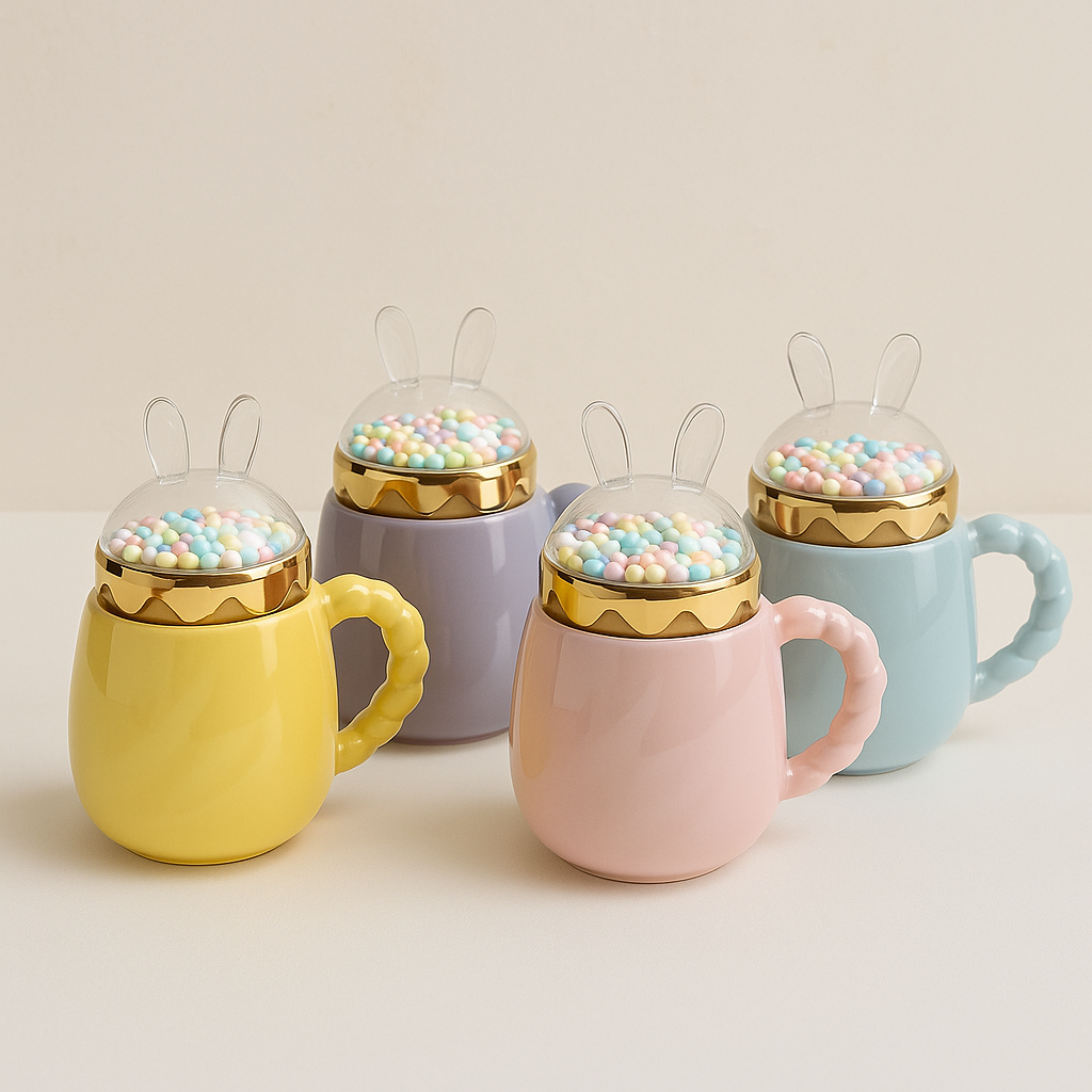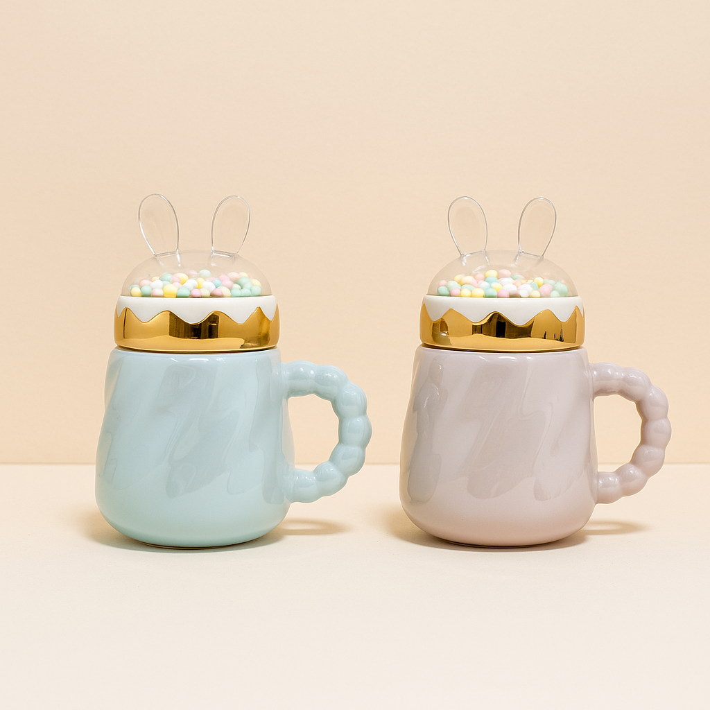 ماگ فانتزی خرگوشی با رنگهای ملایم و درب شفاف پر از توپکهای رنگی. از سرامیک مرغوب ساخته شده و گزینهای عالی برای هدیه و استفاده روزانه است.