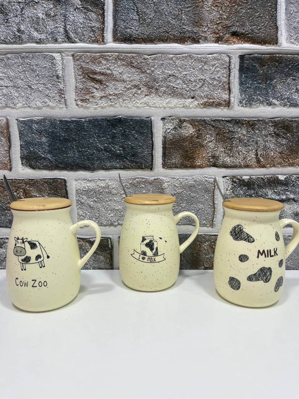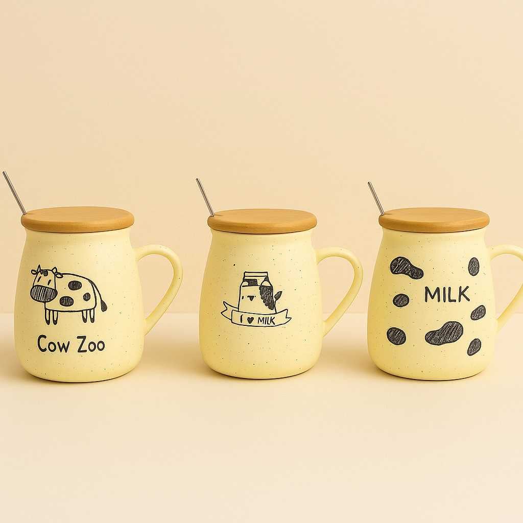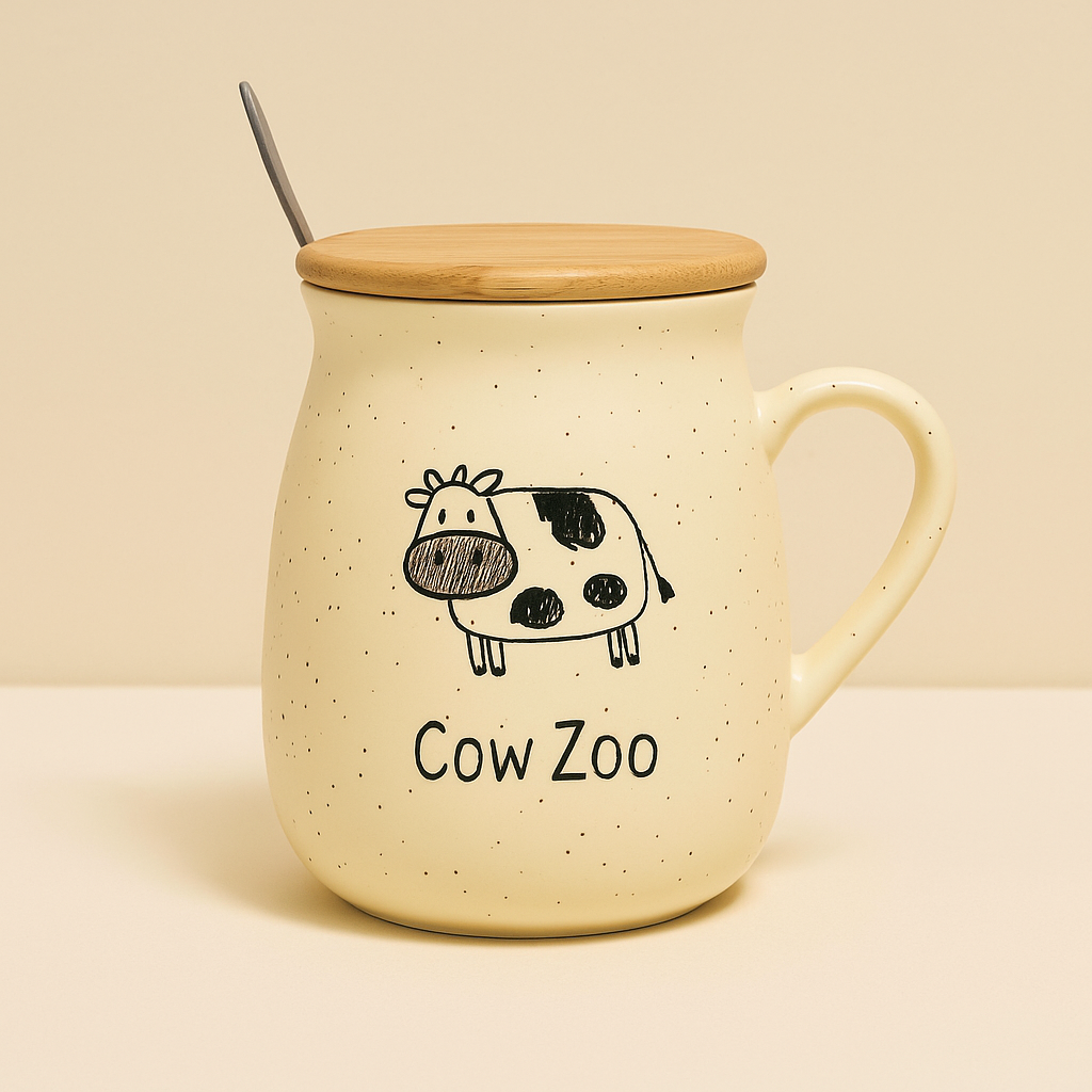ماگ سرامیکی دربدار طرح گاو، انتخابی زیبا و خاص برای دوستداران سبک فانتزی و طبیعی. دارای قاشق فلزی، درب چوبی و طرحهای متفاوت Cow Zoo، I Love Milk و Milk.