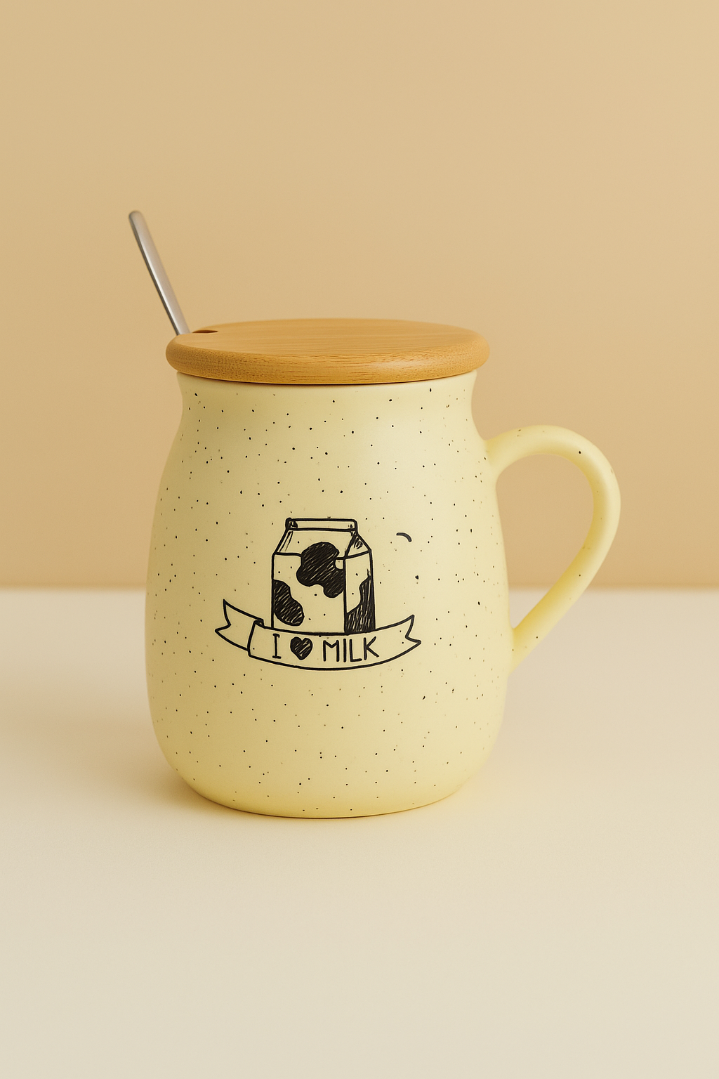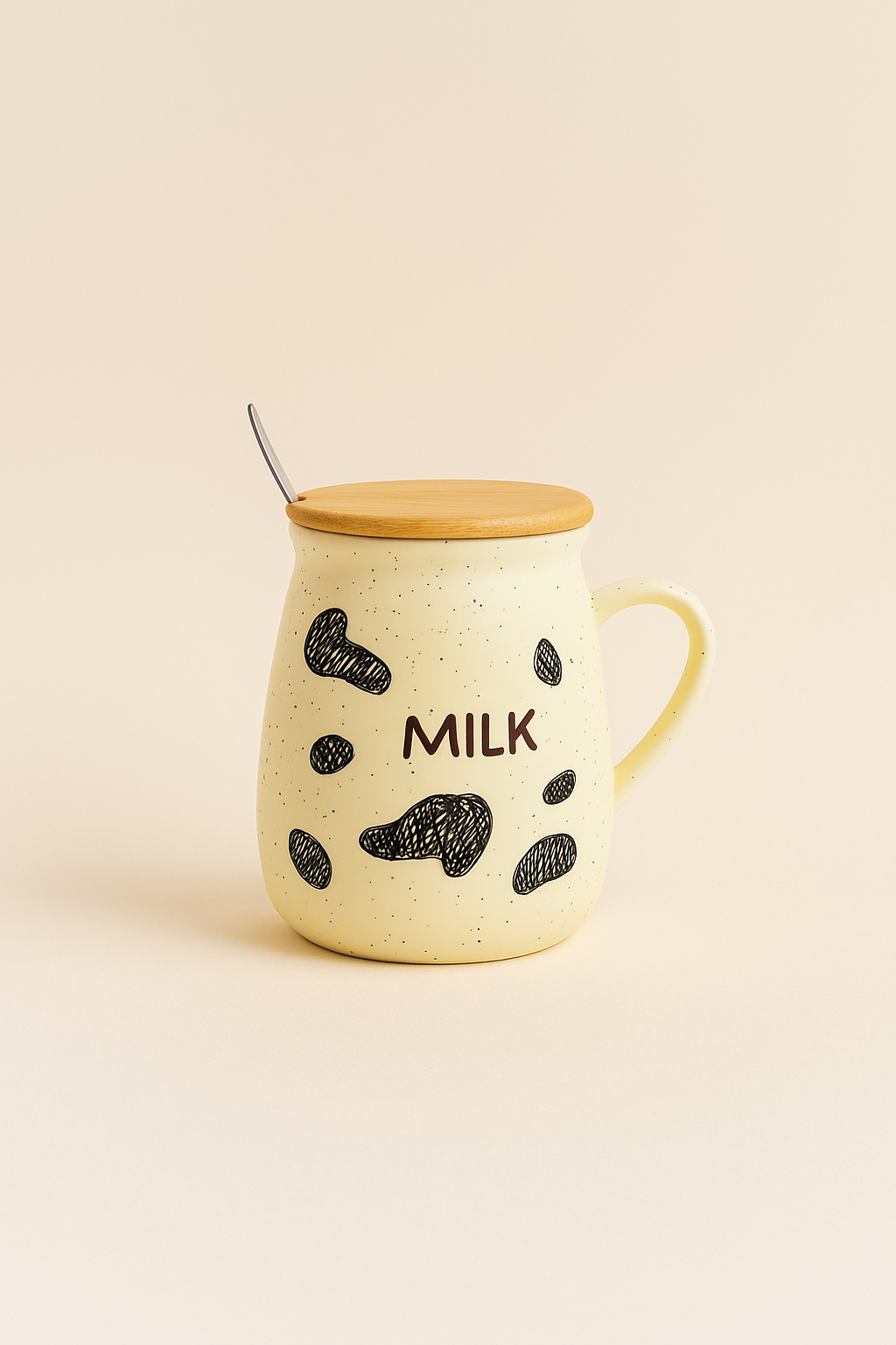 این ماگها از سرامیک باکیفیت بالا ساخته شدهاند و لعاب نیمهمات آنها ظاهری طبیعی و مینیمال دارد. رنگ زمینه کرم روشن با خالهای مشکی کوچک جلوهای خاص و هماهنگ با تم “گاو” ایجاد کرده است. هر ماگ دارای درب چوبی طبیعی و قاشق فلزی براق است که در کنار هم، ترکیبی از زیبایی و کارایی را به ارمغان میآورند.