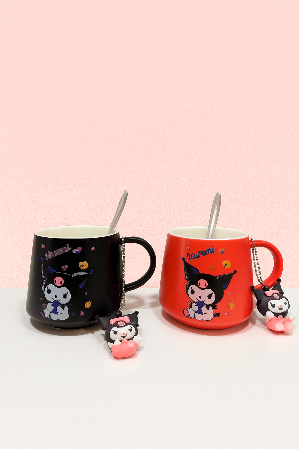 - ماگ سرامیکی کورومی با آویز عروسکی و طرح کارتونی محبوب Kuromi. کیفیت بالا، رنگبندی جذاب و مناسب هدیه دخترانه و استفاده روزمره