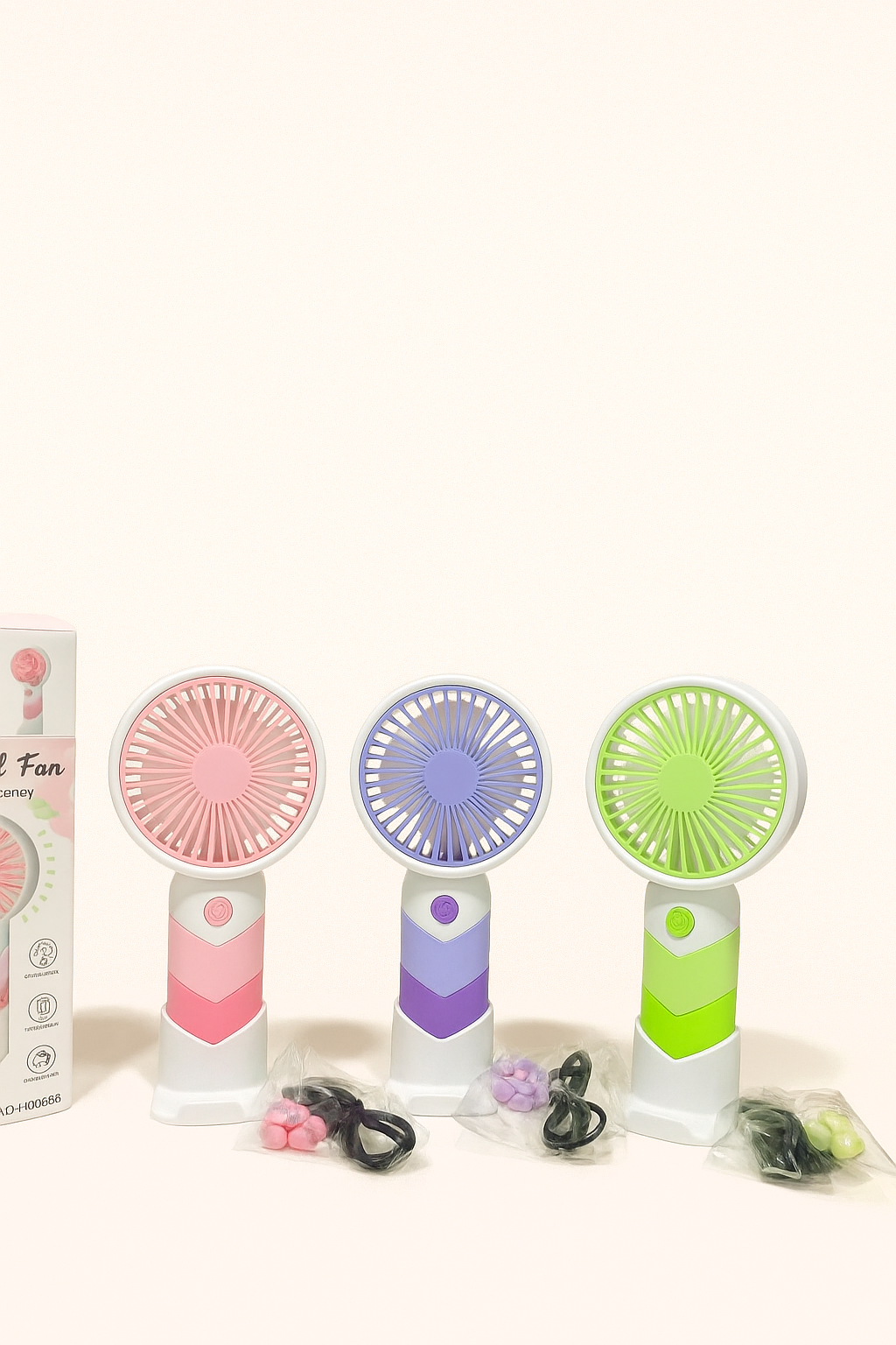 پنکه شارژی دستی با طراحی زیبا و رنگهای شاد (صورتی، بنفش و سبز). سبک، کمصدا و دارای کابل USB برای شارژ آسان. مناسب برای سفر و استفاده روزمره.