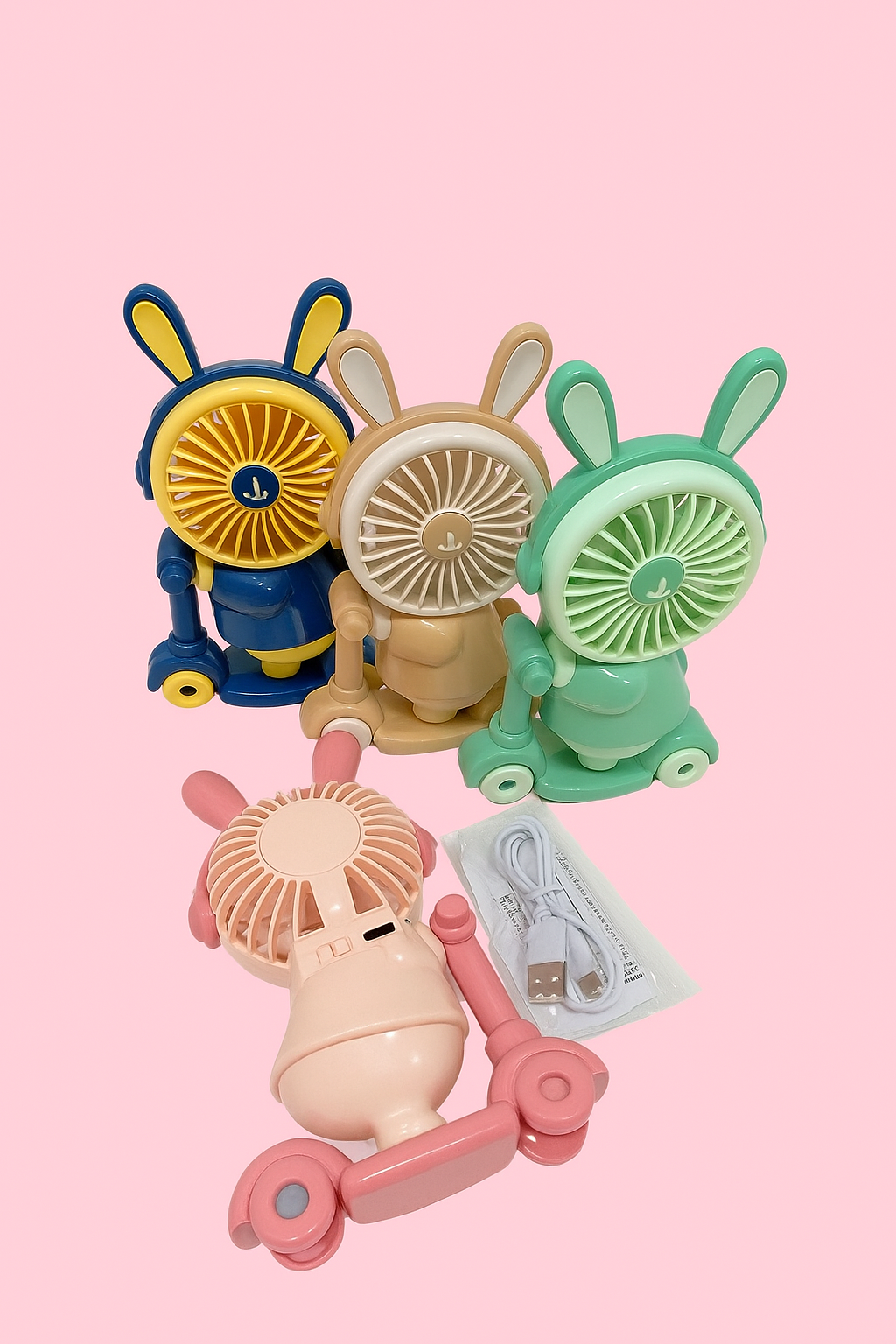 پنکه شارژی فانتزی طرح خرگوشی با تراش سرخود، طراحی پاستلی زیبا و کابل USB. سبک، کمصدا و مناسب میز تحصیل، اتاق کودک و هدیه.