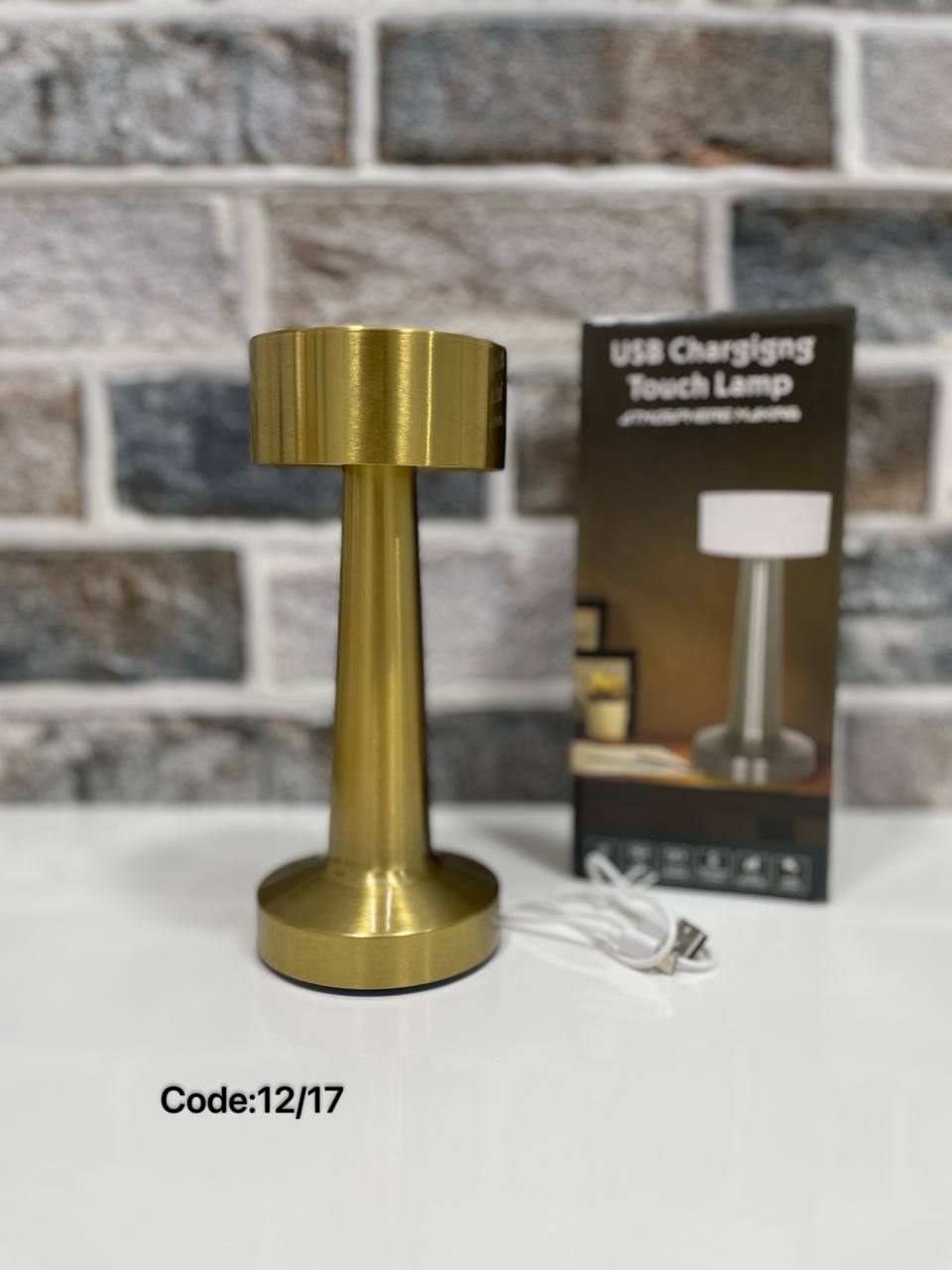 چراغ رومیزی لمسی شارژی USB فلزی با طراحی طلایی، نور ملایم و شارژ USB؛ انتخابی شیک برای اتاق خواب، میز کار و دکوراسیون.